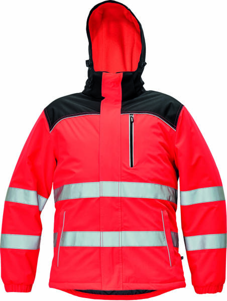 KNOXFIELD HV téli dzseki piros 2XL férfi párnázott jólláthatósági télikabát lecsatolható kapucnival meghosszabbított hátrész megerősített vállrész cipzáras elütő színű mellzseb 2 oldalzseb 2 zárható belsőzseb lehetőség a hímzésre, logózásra a passzé bősége állítható a vállrészen és a zsebeken fényvisszavető szegély van dekoratív varrás