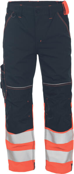 férfi munkanadrág rugalmas derékkal, leengedhető szárakkal és 5 funkcionális zsebbel a nadrágszárakat HI-VIS anyaggal, és 2 nyomtatott fényvisszavető csíkkal kombináltuk megerősített térdrész és térdzseb Oxford 600D anyagból térdvédő behelyezéséhez dekoratív részletek és kontrasztos színű tűzések