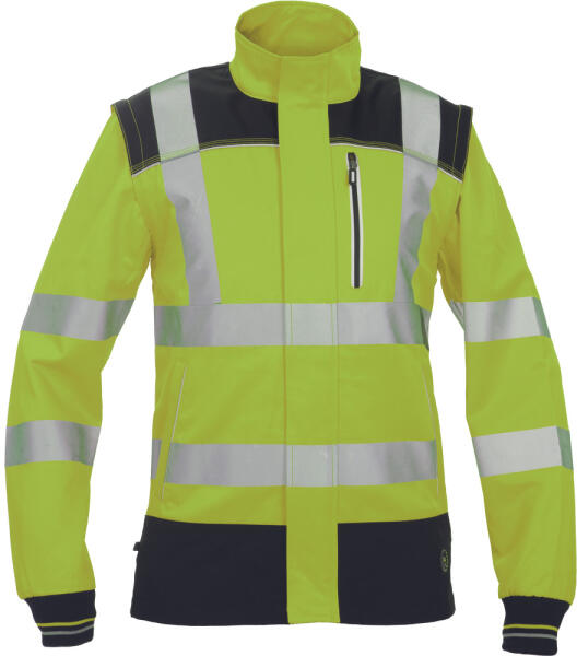 jólláthatósági férfi dzseki levehető ujjakkal, cipzárral záródó kialakításban tépőzáras hajtókával praktikus kialakítás 2 oldalzsebbel, elöl 1 zsebbel, a vállakon Oxford 600D anyagból készült megerősítő rátétekkel a derékrészen, a vállakon és az ujjakon 5cm-es nyomtatott fényvisszavető csíkokkal van ellátva kontrasztos színű tűzések