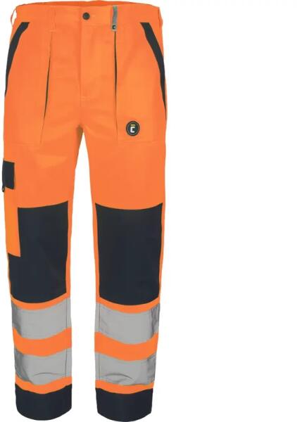 Férfi HI-VIS munkanadrág rugalmas derékrésszel 2 oldalzseb 1 combzseb 2 hátulsó zseb tépőzárral 2 bevarrt, 7,5 cm széles fényvisszavető csík a lábszáron megerősített térdrész hosszabbítható szárhossz