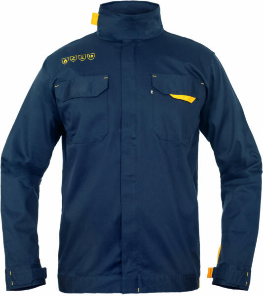 Multinorm munkakabát cipzárral záródó kivitelben, tépőzáras hajtókával. Állógalléros kialakítás, 2 hajtókás mellzsebbel, tépőzárral állítható mandzsettával.