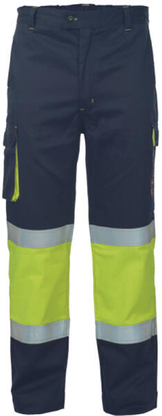 HI-VIS multinorm nadrág rugalmas derékkal, 5 cm-rel meghosszabbítható szárakkal. Praktikus kialakítás 2 oldalzsebbel, a combokon 2 hajtókás zsebbel, 2 tépőzáras hátsó zsebbel. A nadrág a szárakon egy pár 5 cm-es rávarrt fényvisszavető csíkkal van ellátva.