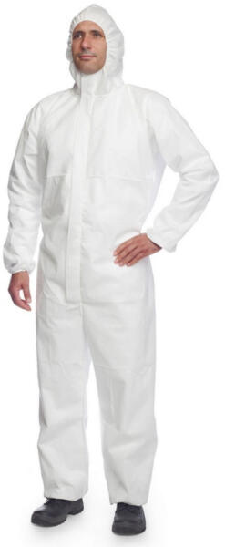 DuPont Multiclean négyrétegű SMMS polipropilén anyag (55 g/m2), színe: kék, nagyon jól szellőző, antisztatikus, kapucnis védőoverall, porok, és radioaktív részecskék elleni védelem, ellenáll folyadékpermetnek, és fröccsenő vegyszereknek (30% kénsav, 10% nátriumhidroxid), gumizott derék-, arc-, csukló- és bokarész, védőhajtókával ellátott cipzár, III. védelmi kategória, 5. és 6. típus