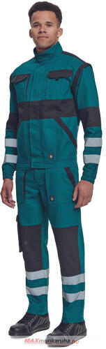 Férfi cipzáras munkakabát levehető ujjakkal, 2 első zsebbel, 2 mellzsebbel. Megerősített váll- és könyökrész, rugalmas mandzsetta és alsó derékszegély. Fényvisszavető csíkok az ujjakon és a kabát hátán. Külső anyag:100 % pamut, 260 g/m2Szabványok:EN ISO 13688