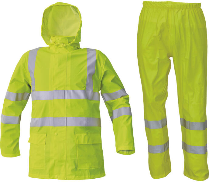 A Cerva láthatósági esőöltönye egy prémium minőségű, esőálló ruházat, mely tökéletes választás a zord időjárási viszonyok között végzett munkákhoz. 200 g/m2 súlyú, poliészter anyaga biztosítja a megfelelő szigetelést és tartósságot. Az anyag vastagsága 0,5 mm, így védi a viselőjét a nedvességtől és a széltől, miközben megőrzi a kényelmet. A láthatósági esőkabát gallérba rejtett kapucnija extra védelmet nyújt viselője fejének és nyakának az eső és a szél ellen. A láthatósági esőnadrág rugalmas dereka és szűkíthető szárai pedig tökéletes illeszkedést és kényelmes viseletet biztosítanak. Az esőruha együttesen két zseb található, melyekben könnyedén tárolhatók a szükséges eszközök, személyes tárgyak. Élénk színének és fényvisszaverő szalagjainak köszönhetően pedig kiemelkedő láthatóságot biztosít gyenge és rossz látási viszonyok között is. Ideális választás építkezéseken, mezőgazdasági munkák során vagy bármilyen kültéri tevékenységhez, ahol a láthatóság és a védelem elengedhetetlen. Válaszd ezt a láthatósági esőruha együttest, és tapasztald meg a prémium minőségű védelem és a kényelem kombinációját az esős napokon!