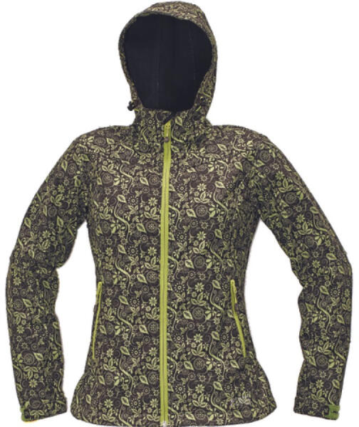Női softshell kapucnis kabát mintás anyagból, 3 rétegű: a külső réteg alatt TPU mebránnal és polár béléssel. A kapucnija zsinórral megköthető. Oldalzsebek cipzárral, kettő belső zseb. Az ujjak tépőzárral szűkíthetők. Nagy teljesítmény: vízoszlop 8000mm, lélegzőképesség 5000 mvp