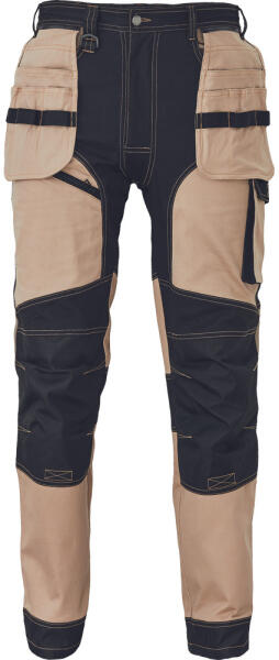 férfi munkanadrág rugalmas derékkal 2 oldalsó zseb, két szerszámtartó zsebbel elöl D-gyűrű 1 oldalsó zseb a lábon hajtókával 1 oldalsó zseb cipzárral 2 hátsó hajtókás zseb megerősített térdrész, térdvédőtartó 5 cm-rel meghosszabbítható nadrágszárak a nadrág hátsó, alsó része megerősített dekoratív varratok 265 g/m2