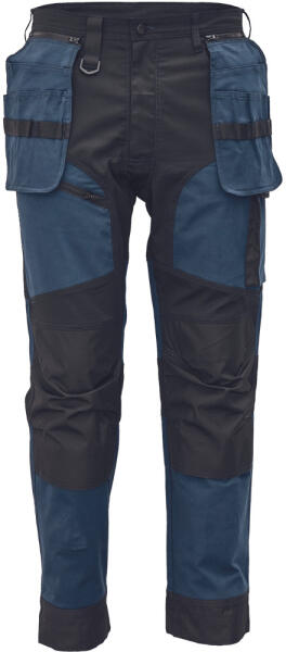 férfi munkanadrág rugalmas derékkal 2 oldalsó zseb, két szerszámtartó zsebbel elöl D-gyűrű 1 oldalsó zseb a lábon hajtókával 1 oldalsó zseb cipzárral 2 hátsó hajtókás zseb megerősített térdrész, térdvédőtartó 5 cm-rel meghosszabbítható nadrágszárak a nadrág hátsó, alsó része megerősített dekoratív varratok 265 g/m2
