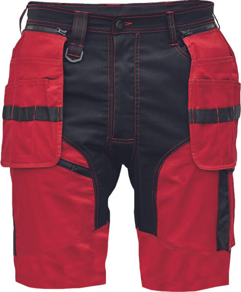 férfi munkanadrág rugalmas derékkal elöl 2 szerszámzsebbel, 1 cipzáras oldalzsebbel, 1 zsebfedős oldalzsebbel a szárakon, 2 zsebfedős hátsó zsebbel, D-gyűrűvel dekoratív varratok