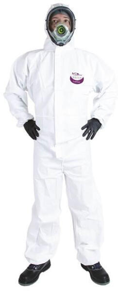 5B/6B típus, III. kategóriájú PPE, a felhasználók folyadékoktól és szilárd részecskéktől való védelmére tervezték, véd a radioaktív részecskék ellen, antisztatikus, csomagolás: 50 db, anyag: polietilén, szín: fehér, méret: L - 3XL.