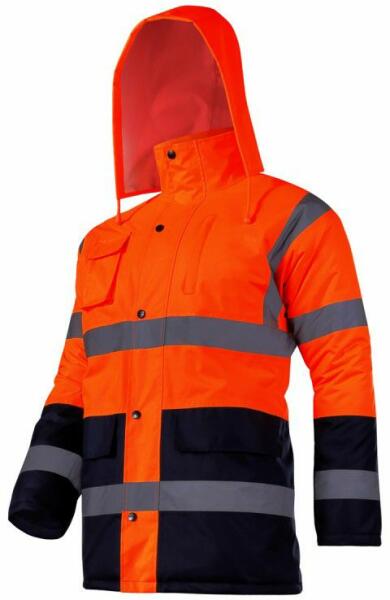 Láthatósági osztály - 3. osztály. Fényvisszaverő csíkok, az EN ISO 20471 standardnak megfelelően (a láthatósági ruházat szabályozási normái). Magas minőségű, vízhatlan anyag (2000mm). Vízálló varrások. Gallérba süllyesztett, zsinórral állítható kapucni. Egyenes mandzsetták és gumis belső mandzsetták, amelyek megvédenek a hidegtől és a széltől. Állítható méret. 7 zseb (4 külső és 3 belső), 6 zseb tépőzárral ellátva (1 cipáras). Levegőztető nyílás. Rejtett cipzárral zárható, tűzőkapcsokkal ellátott.