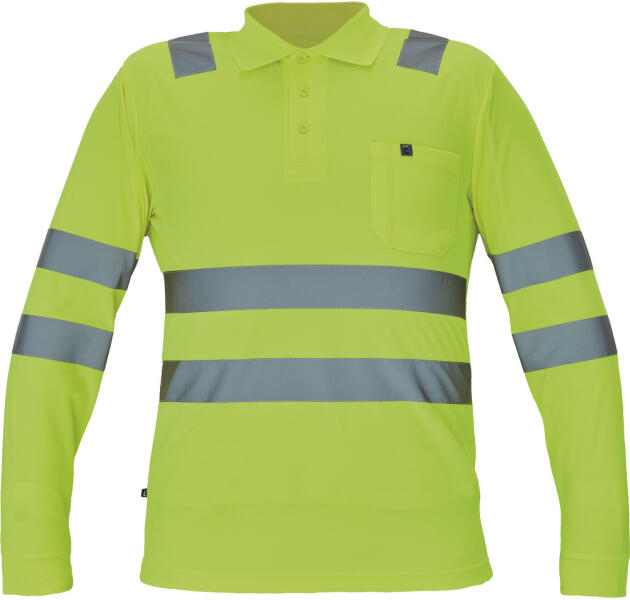 Hi-Vis hosszú ujjú póló 5 cm széles fényvisszavető csíkokkal 3 gombbal záródó nyakkivágás rugalmas mandzsetta 1 mellzseb