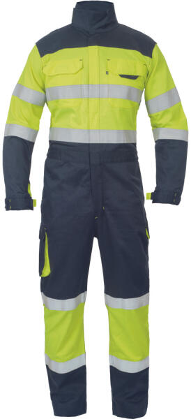 HI-VIS multinorm overall cipzárral záródó kialakításban tépőzáras hajtókával, meghosszabbítható szárakkal. Praktikus kialakítás 2 oldalzsebbel, 2 zsebbel a szárakon 2 mellzsebbel és 2 hátsó zsebbel- tépőzárral záródó hajtókás kivitelben, tépőzárral szűkíthető mandzsettával. A derékrészen, az ujjakon és a szárakon egy pár 5 cm-es varrott fényvisszavető csíkkal van ellátva