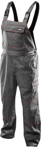 Munkanadrág, kantáros, 35% pamut, 65% poliészter, 245 g/m2, többfunkciós zsebek, gumírozott derék, hely térdvédő szivacsbetét számára, CE, EN ISO 13688:2014 A NEO kantáros munkaruha nadrág kényelmes és praktikus ruházati termék úgy a szakemberek számára, mint a barkácsolóknak, aki maguk végzik az otthoni felújításokat. Strapabíró pamut-poliészter keverékből készül. A többfunkciós zsebekben elférnek a szükséges szerszámok, a bevarrt rugalmas gumival ellátott kantárnak köszönhetően még a nagy terhelés sem okoz kényelmetlenséget munka közben. Zsebekkel habszivacs térdvédőknek a munka kényelmének növelésére. A termék EN ISO 13688:2013 szabvány szerinti kivitelezése és az európai CE tanúsítványa minőségének garanciája. A NEO márka a professzionális igényeket is kielégíti.