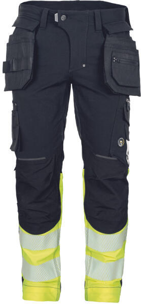 Férfi HI-VIS munkanadrág egyedi négyirányú stretch anyagokból, Trifibetex-PRO® és Trifibetex-VIS® alapanyagból, melyet 2 oldalsó, eltávolítható, multifunkcionális lengőzseb egészít ki 2 elülső ékzseb 2 hátsó felvarrt zseb tépőzárral 2 multifunkcionális combzseb CORDURA® megerősítés a térdrészen, opcionális térdvédő behelyezési lehetőséggel tartós hármas varrás a szárakon és az üleprészen patentos derék 7,5 cm széles nyomtatott és szegmentált fényvisszavető csíkok az alsó szárakon rugalmas derék állítható lábhossz színben harmonizáló fényvisszavető részletek.