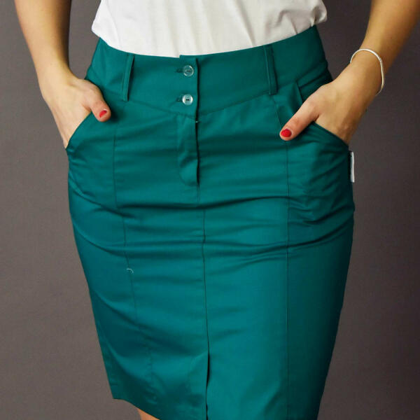 Térd fölötti hosszúságú, elől két gombbal és húzózárral záródó, elején felsliccelt szoknya. Elől két oldalzseb és hátul két bevágott díszzsebbel.
