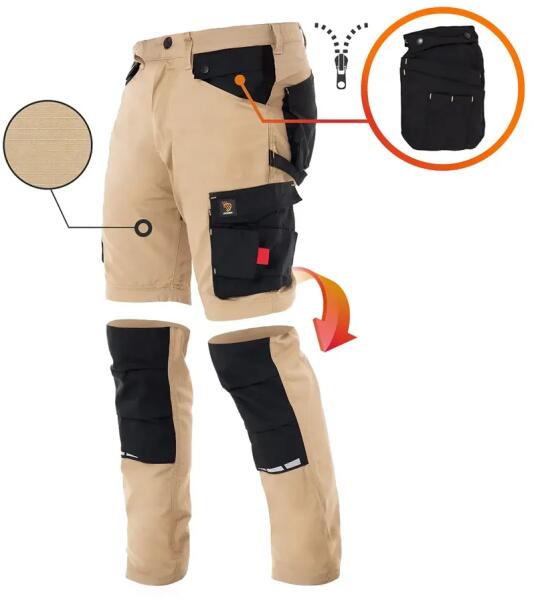 Hasadásmentes RIP-STOP anyagból készült 2 az 1-ben munkásnadrág. Hordható derekas munkásnadrágként, illetve a szárak levételével munkavédelmi rövidnadrágként is.