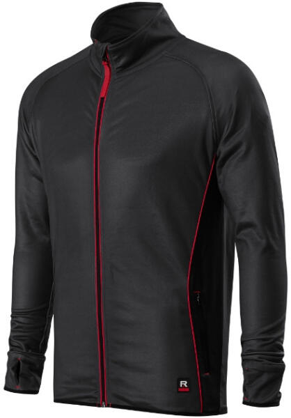 sima, rugalmas, gyorsan száradó anyagegyenes szabás oldalvarrássalfordított cipzár teljes hosszban állvédővelbelső nyakrész szegéllyelraglán ujjak mandzsettán hüvelykujjnak kialakított nyíláscipzáras zsebekelasztikus szegélykontraszt elemekakasztó