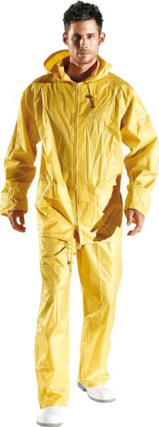 Esőszett nylon/PVC anyagból, hőszigetelt varrásokkal. Lehajtható kapucnival és húzózsinórral, cipzárral, elasztikus szélálló mandzsettával, gombbal állítható, vízálló zsebekkel, húzózsinórral az alján. Elasztikus derékpánttal.