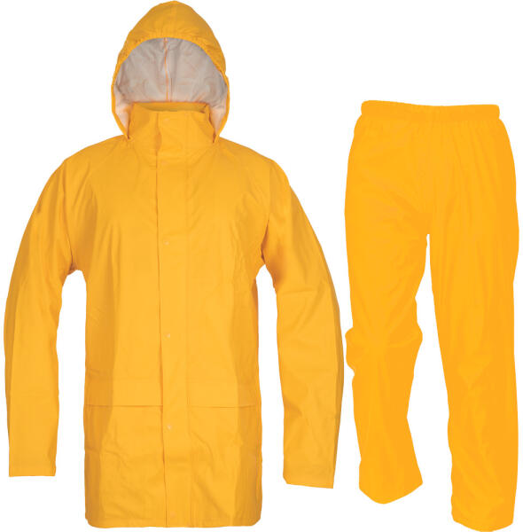 víz- és szélálló esőöltöny esőkabát gallérba hajtott kapucnival és rugalmas derekú nadrággal puha poliészter szövet 2 mély zsebfedős oldalzseb patenttal szűkíthető mandzsetták