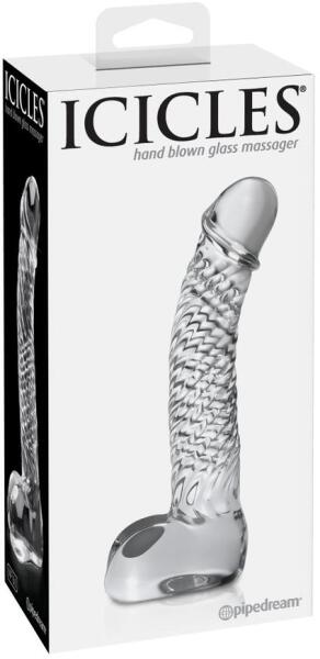 Ivelt kialakítású, bór-szilikát üvegből kézzel készített, pénisz formájú, herékkel kiegészített, spirális barázdákkal texturált, a g-pont stimulálására is alkalmas, motor nélküli dildó. Uniszex, férfiaknak és nőknek, valamint kezdőknek egyaránt ajánlott. A termék nem porózus, lehűthető és melegíthető is. Tisztítása : minden használat előtt és minden használat után langyos szappanos vízzel és segédeszköz tisztítóval kell lemosni. Víz- és szilikonbázisú síkosítóval is kompatibilis, ezek használata javasolt.