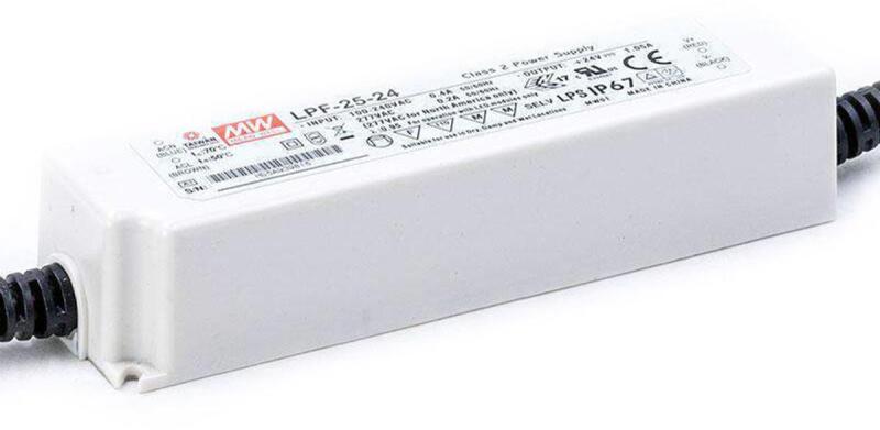 Egykimenetes Mean Well tápegység Class 2 Vin:90-305 VAC/127-431 VDC, Vout: 24 VDC / 0-1.05A, P:25 W, PFC szűrős, 148 x 40 x 32 mm (L x W x H), IP67-es védelem