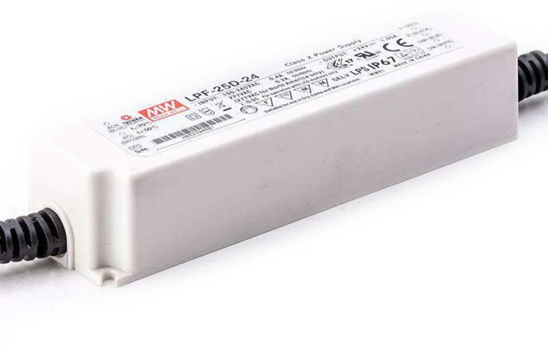 Egykimenetes Mean Well tápegység Class 2 Vin:90-305 VAC/127-431 VDC, Vout: 24 VDC / 0-1.05A, P:25 W, PFC szűrős, 148 x 40 x 32 mm (L x W x H), dimmelhető kontrollerrel vagy potméterrel), IP67-es védelem