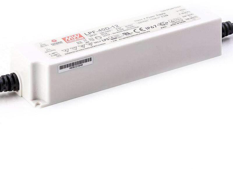 Egykimenetes Mean Well tápegység Class 2 Vin:90-305 VAC/127-431 VDC, Vout: 12 VDC / 0-3.34A, P:40 W, PFC szűrős, 162.5 x 42.5 x 32 mm (L x W x H), dimmelhető ((1-10vDC, PWM kontrollerrel vagy potméterrel), IP67-es védelem