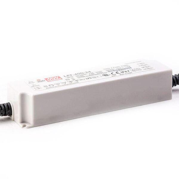 Egykimenetes Mean Well tápegység Class 2 Vin:90-305 VAC/127-431 VDC, Vout: 24VDC / 0-1.67A, P:40 W, PFC szűrős, 162.5 x 42.5 x 32 mm (L x W x H), dimmelhető ((1-10vDC, PWM kontrollerrel vagy potméterrel), IP67-es védelem