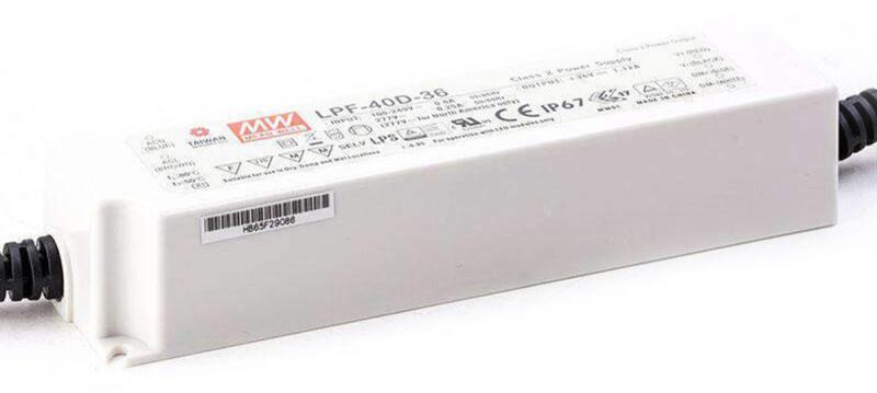 Egykimenetes Mean Well tápegység Class 2 Vin:90-305 VAC/127-431 VDC, Vout: 36 VDC / 0-1.12A, P:40 W, PFC szűrős, 162.5 x 42.5 x 32 mm (L x W x H), dimmelhető ((1-10vDC, PWM kontrollerrel vagy potméterrel), IP67-es védelem