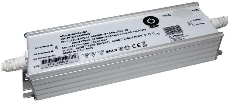 POS Power Tápegység POS MCHQ200V12-GA, LED meghajtó 12V/16A CV, fémház, PFC, univerzális AC bemenet (max. 305VAC), Uo/Io állítható (MP-MCHQ200V12-GA)