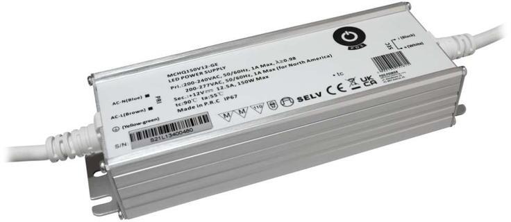 POS Tápegység POS MCHQ150V12-GE, LED meghajtó 12V/12.5A 150W CV, fémház, PFC, EU AC bemenet (180-305VAC), IP67, nem állítható (MP-MCHQ150V12-GE)