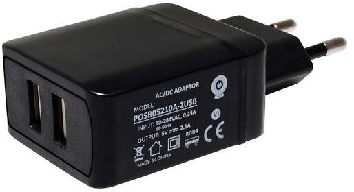 POS Tápegység POS POSB05210A-2USB, impulzus 5V/2.1A/10.5W, függőleges adapter, AC: CEE7/16. DC: USB x2 (MP-POSB05210A-2USB)