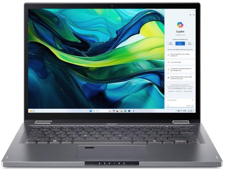 Acer Aspire Spin 14/ASP14-52MTN-541L/U5-115U/14"/WUXGA/T/ 16GB/512GB/Intel int/W11H/Gray/2R, Acer Aspire Spin 14 (ASP14-52MTN-541L)* SW NitroSense* Copilot billentyűOperációs rendszer: Windows 11 HomeProcesszor: Intel Core Ultra 5 115U (8 mag - 2P + 4E + 2LPE, 10 szál, P-core 1,5/4,2 GHz, E-core 1,0/3,5 GHz, LPE-core 0,7/2,1 GHz, 10 MB cache)Memória: 16GB LPDDR5x az alaplaponMerevlemez: 512GB PCIe NVMe SSD PM4Optikai meghajtó: nemKártyaolvasó: nemKijelző: érintőképernyős 14" WUXGA (1920x1200) 16:10 fényes IPS, 60HzVideokártya: Integrált Intel Iris/Intel UHD GraphicsAudio: 2x hangszóró; 2x mikrofonWebkamera: FHD USB TNRMutatóeszköz: Precision TouchpadBillentyűzet: fehér háttérvilágítású numerikus blokk nélkülUjjlenyomat-olvasó: igenHálózat: nemVezeték nélküli kommunikáció: WLAN + Bluetooth (Wifi 6E Intel 802.11ax 2x2 + BT 5.3 LE)USB portok:* 2x USB-C támogatással: USB4® 40 Gb/s/DisplayPort USB-C-n keresztül/Thunderbolt 4/töltés USB-n keresztül 5 V; 3 A/DC-in 20 V; 65 W* 2x USB 3.2 Gen 1Egyéb portok:* 1x HDMI 2.1* 1x kombinált fejhallgató/mikrofon csatlakozó (3,5mm)* 1x Kensington biztonsági zárhelyAkkumulátor: 50Wh Li-ionTápellátás: 65W USB-C AC adapter PCR50%Szín: AcélszürkeMéretek: 318,5x225,5x21,1mmSúly: 1,5kgGarancia: 2 év