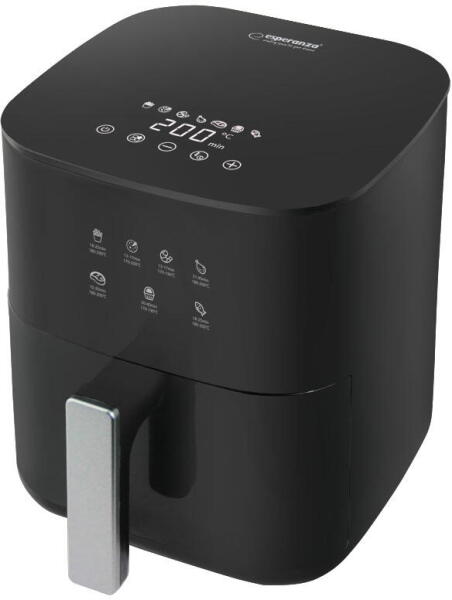 Az Esperanza PATATE FRITTE olajmentes fritőz tökéletes megoldás azok számára, akik egészségesebb módon szeretnék élvezni a sült ételek ízét. Ezzel a készülékkel ropogós sült krumplit, lédús csirkét vagy ízletes zöldségeket készíthet olaj használata nélkül gyorsan, kényelmesen és az íz feláldozása nélkül. Nagy teljesítményének és forró levegő keringetésének köszönhetően az étel egyenletesen sül és néhány perc alatt elkészül. Modern kialakításának köszönhetően stílusos kiegészítője lehet bármely konyhának, míg az intuitív kezelőpanel 7 előre beállított főzési programmal biztosítja a könnyed használatot. Az állítható hőmérséklet-beállítások és a beépített időzítő teljes kontrollt biztosítanak a főzési folyamat felett, a csúszásmentes gumilábak pedig stabilan tartják a készüléket a konyhapulton. Ez a funkcionális és praktikus eszköz biztosan minden háztartás kedvencévé válik.