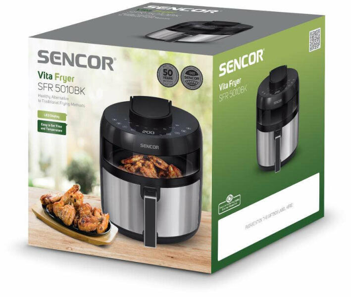 A Sencor SFR 5010BK forrólevegős fritőz a hagyományos olajban sütés egészséges alternatívája. A készülék 1500 W teljesítménnyel 5,0 literes kapacitású kosárral és állítható hőmérséklet szabályzóval lett felszerelve. Mindössze 4 perc szükséges a felfűtéshez és már készítheti is kedvenc fogásait zsiradék hozzáadása nélkül, legyen az hasábburgonya, hal vagy zöldség. A gyárilag beállított 8 program is az Ön kényelmét hivatott szolgálni. A készülék egyik nagy előnye a kivehető sütőkosár, amely tapadásmentes felülettel és hideg érintésű fogantyúval lett ellátva. A Sencor forrólevegős fritőz légszűrővel és speciális levegő keringgető rendszerrel lett ellátva, amely csökkenti a kellemetlen szagok kialakulását.