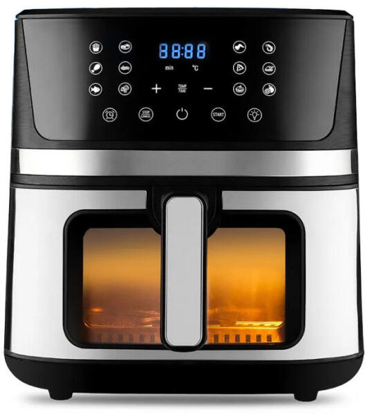 Ez a 7 literes, 1800W teljesítményű forrólevegős fritőz ideális választás az egészséges és gyors ételkészítéshez! A nagy űrtartalom lehetővé teszi, hogy egyszerre több adag ételt süss, míg a 12 előre beállított program segít a tökéletes eredmény elérésében minden alkalommal. A széles hőmérséklet-tartomány (80-200°C) és a 60 perces időzítő segítségével egyszerűen szabályozhatod a sütési folyamatot. A beépített betekintőablak lehetővé teszi, hogy folyamatosan figyelemmel kísérd az étel állapotát, anélkül hogy ki kellene nyitnod a készüléket. A tapadásmentes bevonat megkönnyíti a tisztítást, míg a csúszásgátló lábak biztonságos használatot biztosítanak. A modern LED érintőkijelző stílusos megjelenést és egyszerű vezérlést kínál. Elegáns megjelenésű, praktikus és megbízható eszköz , amellyel nemcsak süthetsz, de grillezhetsz, melegíthetsz, párolhatsz és piríthatsz is – ráadásul olaj hozzáadása nélkül!
