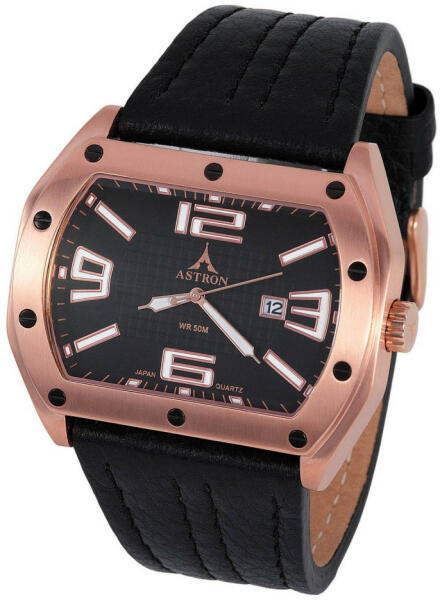 ASTRON 5698-0 férfi karóra, rózsaarany színű nemesacél tok, fekete bőrszíj, fekete számlap, keményített ásványüveg, quartz szerkezet, 50 m (5 ATM) vízállóság (5698-0)