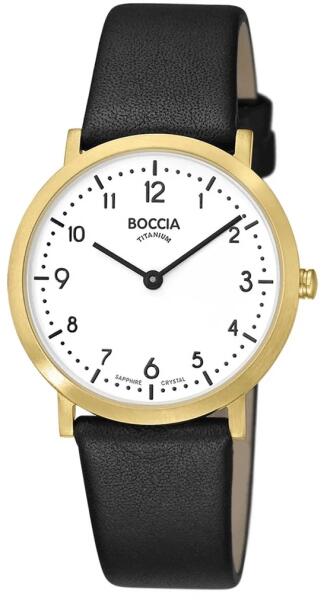 Márka: BOCCIA TITANIUM | Modell: 3335-02 | Garancia: 2 évek | Szín: fekete | Tok színe: arany árnyalat | Tok anyaga: titán | Táplálás: elem | Szíj anyaga: bőr | Vízálloság: 50M/5ATM | Üveg: zafír | Forma: kerek | Számjegyek a számlapon: arab | Rendeltetés: női | Termék típusa: karórák | Típus: analóg | Szíj szélessége: 18 | Átmérő: 34 | Vastagság: 6