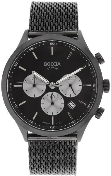 Márka: BOCCIA TITANIUM | Modell: 3750-06 | Garancia: 2 évek | Szín: fekete | Tok színe: fekete árnyalat | Tok anyaga: titán | Táplálás: elem | Szíj anyaga: nemesacél | Funkciók: Dátum – a hónap napja | Funkciók: Stopper | Funkciók: Super-LumiNova | Vízálloság: 50M/5ATM | Üveg: zafír | Forma: kerek | Számjegyek a számlapon: indexek | Rendeltetés: férfi | Termék típusa: karórák | Típus: analóg | Szíj szélessége: 20 mm | Átmérő: 41 mm | Vastagság: 10 mm