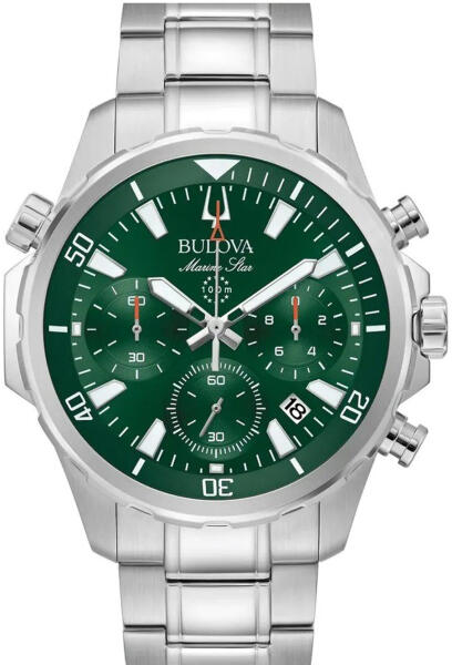 Gyártói szám: 96B396Gyártói sorozat: Férfi Óra Marine Star Chronograph 47mmFunkciók: Kronográf, Dátum, Óra, Perc, MásodpercHajtás: Elem (kvarc)Számlap színe: ZöldKijelző: AnalógVízállóság: 10Lünetta: kétirányúFelületkezelés: Mattított, PolírozottTok színe: EzüstTok anyaga: Rozsdamentes acélTok vastagsága: 12Tok alakja: KerekTok szélessége: 47Hátlap: csavaros, Rozsdamentes acél aljNem: FérfiÜveg: kristályüvegVilágítás: Világító mutatók, Világító indexekStílus: KlasszikusSzíj anyaga: Rozsdamentes acélSzíj színe: EzüstFülszélesség: 22Csat: Csatos zárMaximális csuklókerület: 220Tárgy súlya: 0.18Szállítási terjedelem: Doboz, Használati utasítás, Csomagolás, Garanciális dokumentum