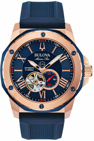 Márka: BULOVA | Kollekció: Marine Star | Modell: 98A227 | Garancia: 5 évek | Szín: kék | Tok színe: rózsaarany | Tok anyaga: nemesacél | Táplálás: automata | Szíj anyaga: műanyag | Vízálloság: 200M/20ATM | Üveg: ásványi | Forma: kerek | Csatolás típusa: standard felcsatolás | Számjegyek a számlapon: római | Rendeltetés: férfi | Minimális kerület: 17,5 | Termék típusa: karórák | Típus: analóg | Maximális kerület: 22,5 | Szíj szélessége: 24-22 | Átmérő: 44 | Vastagság: 13