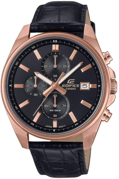 Casio EFV-610ECL-1AUEF Férfi Karóra - Edifice Chronograph Elegancia és sportos dinamizmus – tökéletes választás a modern férfi számára! A Casio Edifice EFV-610ECL-1AUEF egy stílusos, közepes méretű kronográf karóra, amely ötvözi a rózsaarany színű tok nemes megjelenését a fekete bőrszíj klasszikus eleganciájával. A széles számlap könnyen leolvasható, miközben a kronográf funkciók pontos időmérést biztosítanak akár sportolás közben is. Főbb jellemzők:
