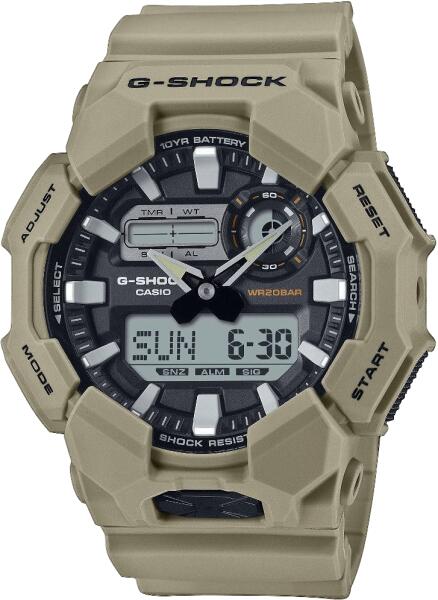 Casio GA-010-5AER Férfi Karóra - G-ShockA Casio GA-010-5AER férfi karóra egy tartós és sokoldalú időmérő, amely hosszú élettartamú elemmel és nagy strapabírással rendelkezik. A masszív, nagy méretű tok és a digitális-analóg kijelző több praktikus funkcióval van ellátva, mint a világidő, stopper és LED háttérvilágítás, amelyek tökéletes láthatóságot biztosítanak még sötétben is. Főbb Jellemzők