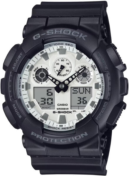 Casio GA-100WD-1AER Férfi Karóra - G-ShockA Casio GA-100WD-1AER férfi karóra a G-SHOCK sorozat letisztult, mégis robusztus modellje, amely a matt fekete és fényes fehér kontrasztjával tűnik ki. Ez a strapabíró karóra 20 bar vízállósággal, ütésálló kialakítással, mágneses ellenállással, és LED világítással rendelkezik, így ideális választás mindennapi használatra és sporttevékenységekhez egyaránt. Főbb Jellemzők