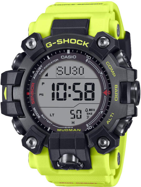 Casio GW-9500MRY-1A9ER Férfi Karóra – G-Shock MudmanA Casio GW-9500MRY-1A9ER a G-SHOCK Master of G sorozat MUDMAN szériájának tagja, amelyet kifejezetten extrém környezetekhez, mentő- és túrafeladatokra fejlesztettek ki. A feltűnő sárga szíj azonnal felismerhetővé teszi, miközben a szénszál-erősítésű karbon tok és sárálló felépítés strapabíróvá varázsolja. A karóra rádióvezérelt (Multi Band 6) és Tough Solar napelemes rendszerrel működik. Az új dupla rétegű LCD kijelző pedig még tisztább iránytű-adatokat és érzékelő-információkat biztosít bármilyen fényviszony között. Főbb jellemzők: