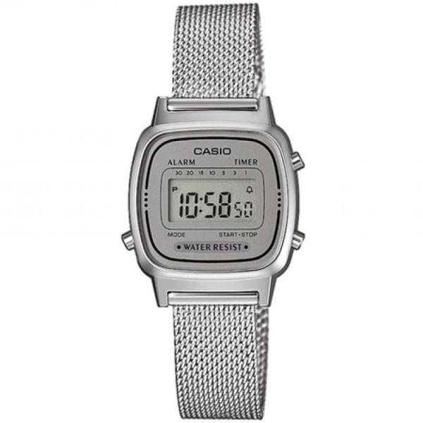 Casio LA670WEM-7EF Női Karóra – VintageA Casio LA670WEM-7EF egy igazi retro stílusú női digitális karóra, amely elegáns ezüst mesh szíjjal és lekerekített sarkú digitális kijelzővel rendelkezik. Klasszikus, letisztult megjelenése tökéletes kiegészítője lehet a mindennapoknak. A modell kis mérete és könnyű súlya rendkívül kényelmessé teszi a viselést, miközben a praktikus funkciók – mint például az ébresztő, stopper és visszaszámláló – hasznos segítséget nyújtanak a nap folyamán. Vízálló kialakításának köszönhetően a fröccsenő víz sem jelent problémát. Főbb jellemzők:
