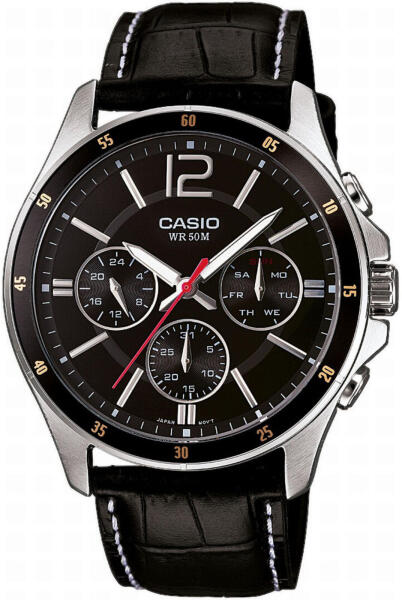 Casio MTP-1374PL-1AVEF Férfi Karóra - CollectionA Casio MTP-1374PL-1AVEF férfi karóra elegáns és praktikus választás, amely kiváló minőségű anyagokat ötvöz klasszikus stílussal. Az acél tok és a bőr szíj időtálló megjelenést biztosítanak, míg az ásványi üveg védi a számlapot a mindennapi behatásoktól. Az óra három segédszámlapja megjeleníti a dátumot, napot és a 24 órás időformátumot, így funkcionális kiegészítője lehet mindennapjainknak. Az 50 méteres vízállóság lehetővé teszi, hogy az óra vízálló legyen zuhanyzás közben is, így ideális mindennapi viseletre. Főbb Jellemzők