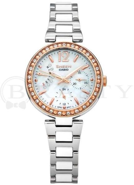 Divat  Casio  karórák  a Sheen kollekcióból. Ideális kiegészítők nőknek ,   akik előnyben részesítik az analóg és kerek alakú karórákat. A belül ellenálló 10 mm magas tokban, melyet minőségi acél  alkot , megbízható elemes (quartz) gépezetet talál, mely 32 mm átmérőjű számlapot működtet. A számlapot ellenálló ásványi üveg  véd. A tok ezüst, számlap gyöngyház és a szíj fehér színű. Anyagát tekintve acél. A karórák v ízállósága  5 ATM .   Használati utasítás csak angol nyelven van Akár 80% kedvezmény több száz termékre!  Itt van a Fekete Péntek!