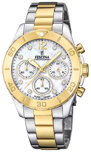 Festina 20604/1 női karóra a népszerű Boyfriend kollekcióból. Kettős időkijelzés. Az óra tökéletes dizájn, amit imádni fogsz. Az elegáns óramodell jellegzetes, tömör lunettával és részletes kijelzővel rendelkezik. Az ezüst-arany színű kivitelnek köszönhetően az óra ragyogóan fog ragyogni a női csuklón. A precízen megmunkált kijelzőt csillogó strasszkövek és egyszerű kronográfok gazdagítják. A csuklós rozsdamentes acél szíj kellemesen sima tapintású, így az óra egész nap kényelmes viseletet biztosít. A szíj a kívánt hosszúságra állítható.